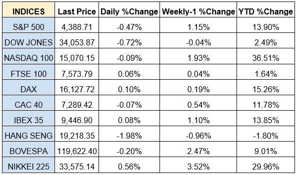 The global markets started the week higher, as investors were waiting for the reports on inflation in Germany, but also in the United States, and unemployment in the United Kingdom. Moreover, on Tuesday, Consumer prices in Germany rose to 6.1% in May as expected compared to the same month a year earlier but the figure marks a decline from April when inflation stood at 7.2%. Furthermore, the unemployment rate in the United Kingdom went up by 0.1 percentage point in the trimester to April compared to the previous quarter to land at 3.8%, marginally lower than market expectations. On the same day, the annual inflation in the United States came in at 4.0% in May, declining from the 4.9% registered in April and standing slightly lower than analysts predicted. On Wednesday, the United Kingdom’s gross domestic product (GDP) rose by 0.2% in April. According to the report, the GDP increased by 0.1% in the three months to April 2023. Furthermore, United States Federal Reserve’s Federal Open Market Committee (FOMC) announced on Wednesday that it has unanimously decided to suspend its interest rate increases in June, after 10 straight hikes, and leave the federal funds rate at 5.25%. Following the above news, the global market closed mix on Wednesday. The European Central Bank decided on Thursday to raise its three key interest rates for the eighth time in a row, this time by 25 basis points. Also, on the same day, the number of seasonally adjusted initial jobless claims in the United States remained unchanged at 262,000 in the week ending June 10. On Friday, the annual inflation in the euro area clocked in at 6.1% in May, while the monthly rate remained unchanged. Finally, the global stock markets ended the week mixed, after a week full of important economic data and financial updates. The Dow Jones closed with a loss of 0.32% at the closing bell on Friday. The S&P declined by 0.37%. Furthermore, the DAX rose by 0.54% and the CAC 40 increased by 1.34%. The FTSE 100 rose by 0.19%.
